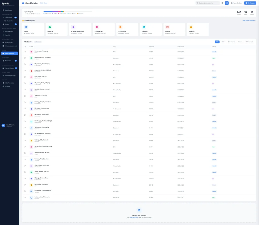 Anstatt Dateien unkontrolliert in Ordnern oder externen US-Clouds abzulegen, werden alle Informationen zentral, nachvollziehbar und geschützt innerhalb der Synnio-Plattform gespeichert.