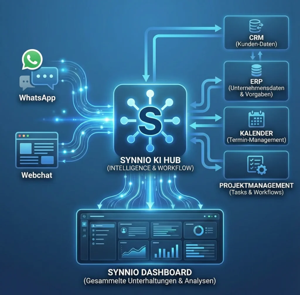 Mit den KI Webchat- und WhatsApp-Bots von Synnio automatisieren Unternehmen ihre digitale Kundenkommunikation über Website und Messenger.