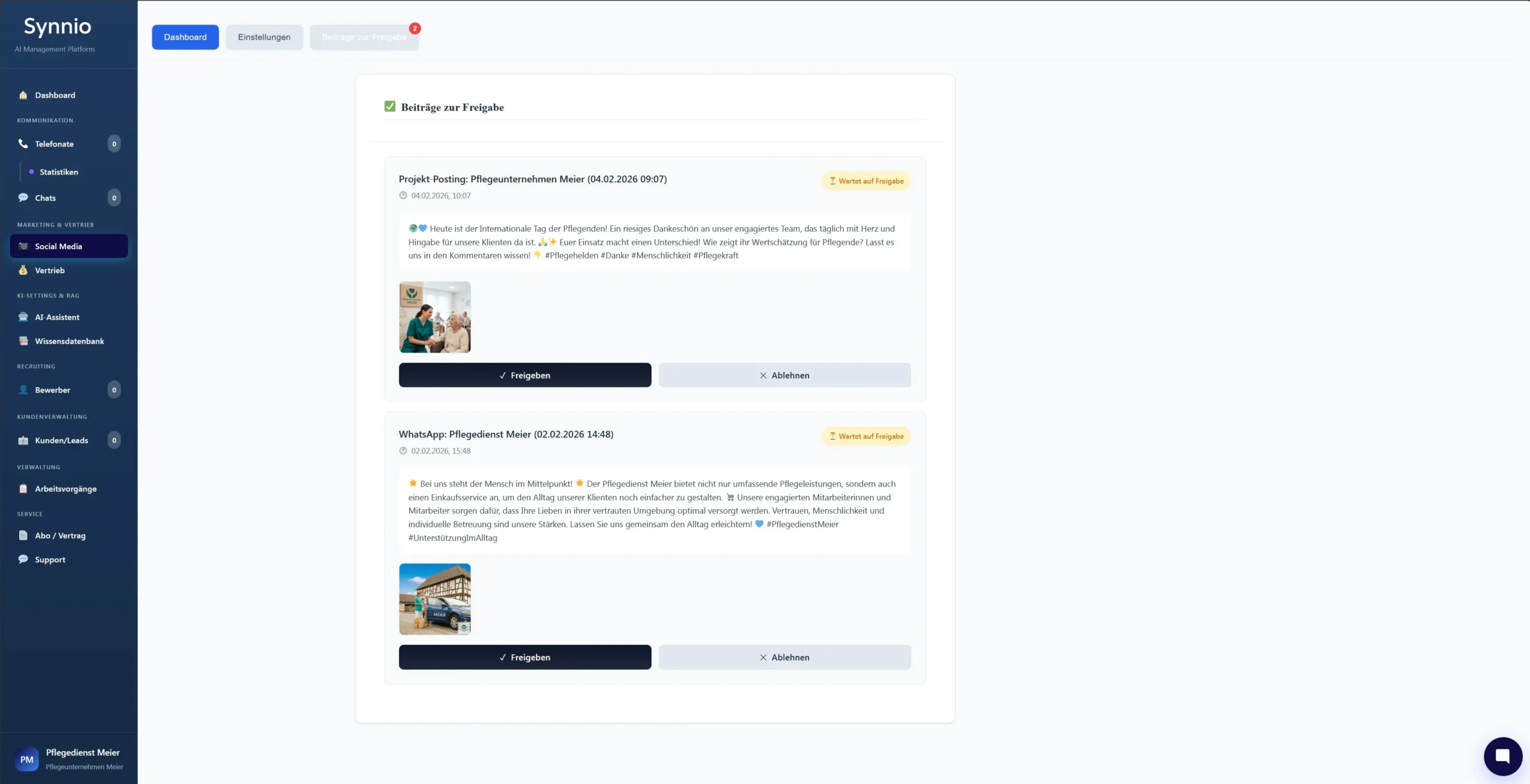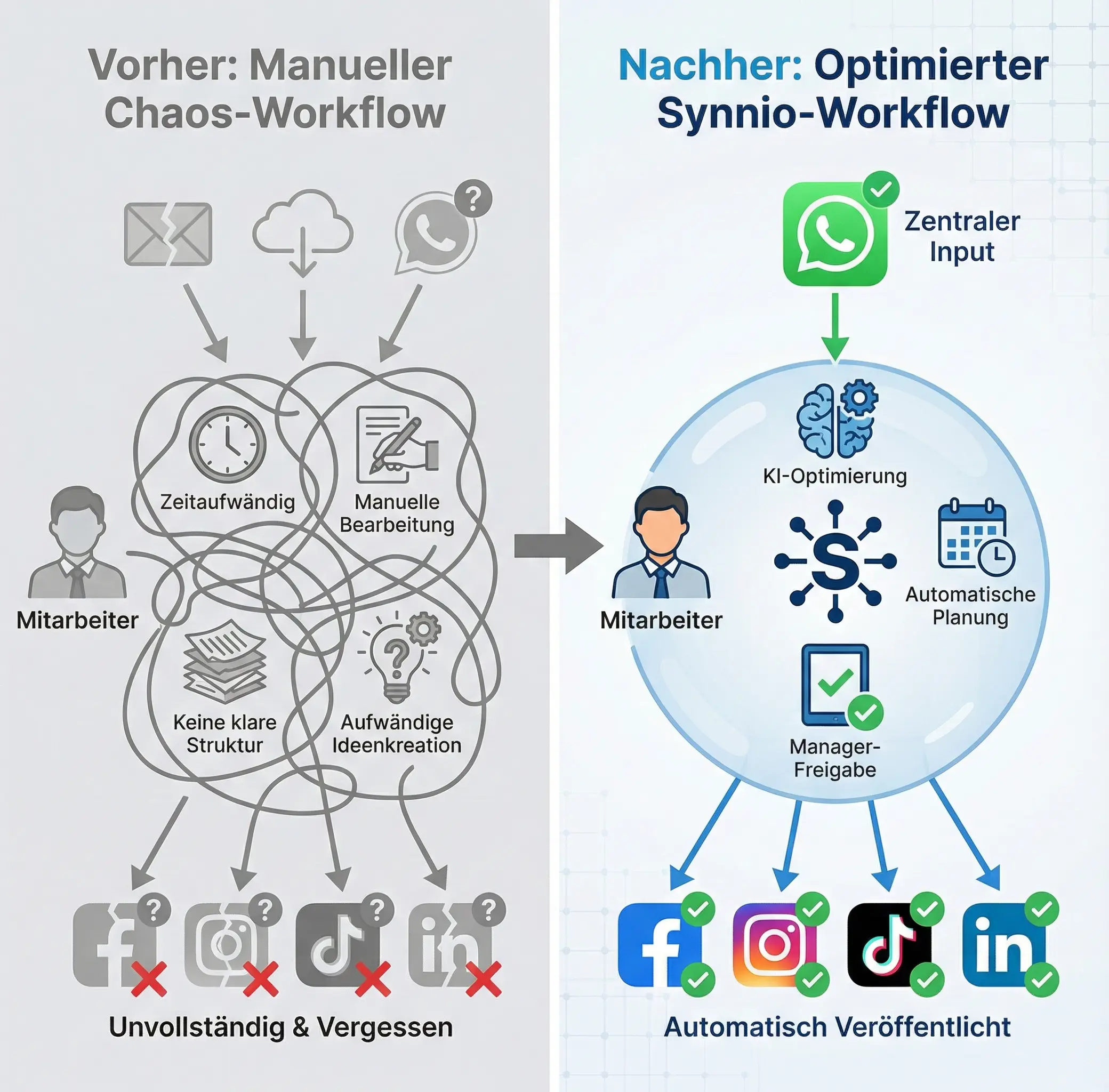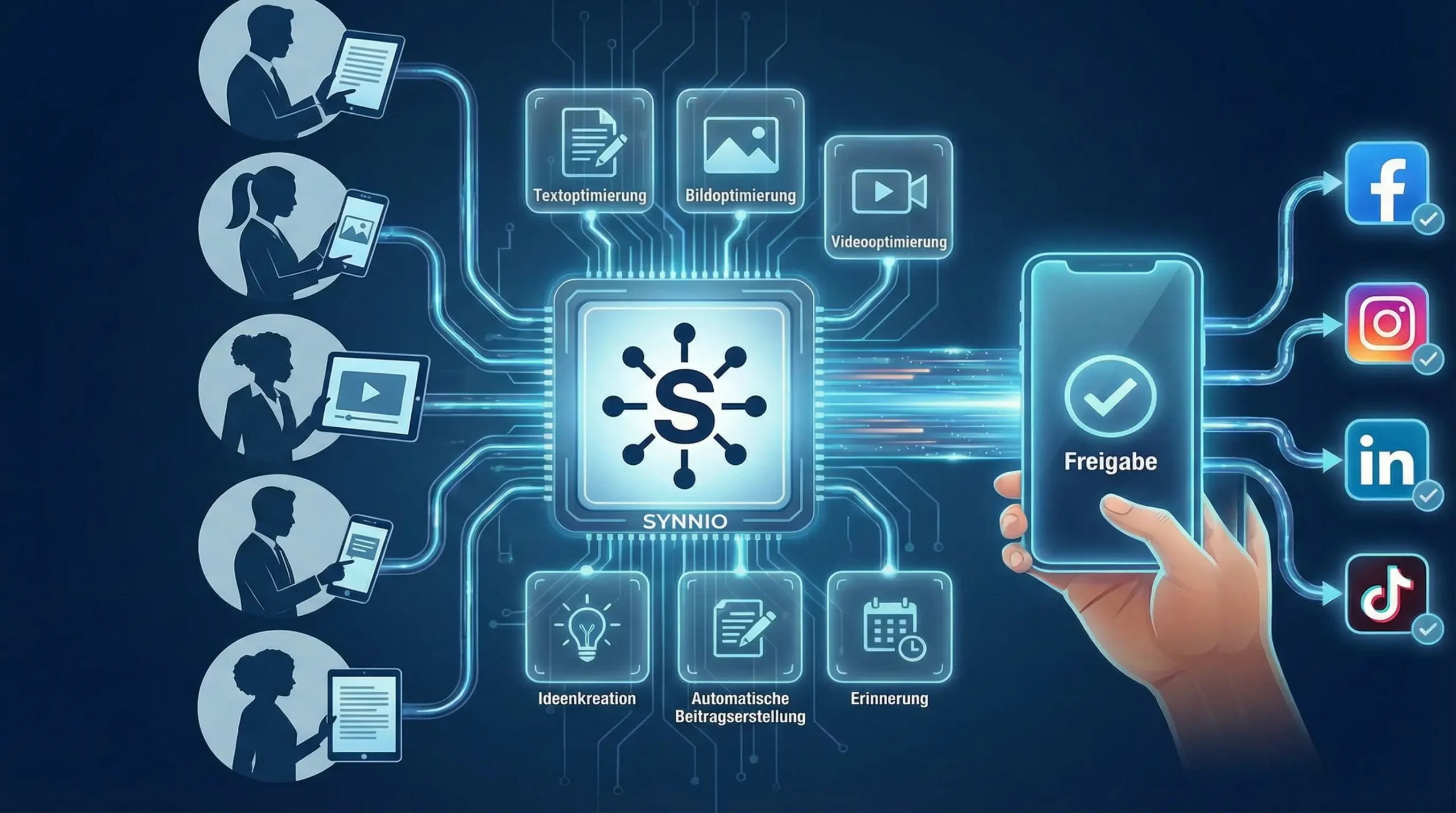 Dieses Know-how ist direkt in Synnio eingeflossen. Prozesse, Freigaben, Inhalte und Automatisierungen wurden so aufgebaut, dass sie für Unternehmen intuitiv, effizient und zuverlässig funktionieren. Ohne komplizierte Tools, ohne Schulungsaufwand und ohne zusätzliche Belastung für Mitarbeiter oder Führungskräfte.